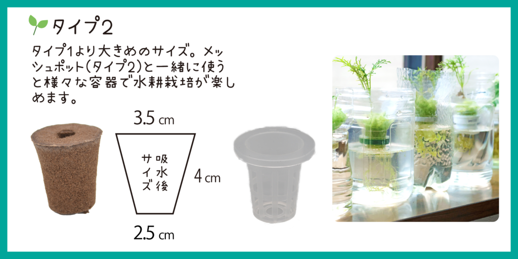 ■タイプ2:タイプ1より大きめのサイズ。メッシュポットと一緒に使うと様々な容器で水耕栽培が楽しめます。