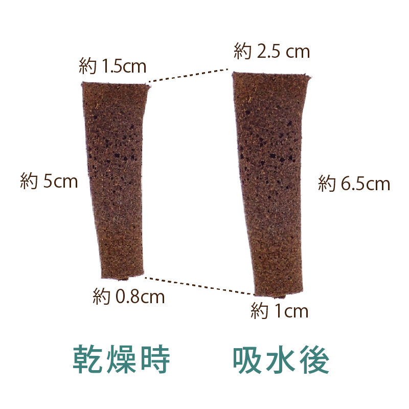 仕様前は乾燥しており、サイズが小さく収納に適しています。水に浸すことで膨らみ、植物育成用のスポンジとして機能的な状態へ変化します。仕様前に2~3分ほど水につけておくと完全に膨らみます。形は円錐台形をしており、上部の直径が約2cm、下部の直径が約1cm、高さが約6.5cmとなります。