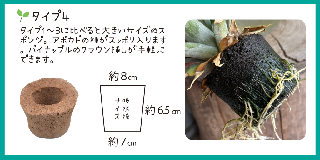 ■タイプ4:タイプ1~3に比べると大きいサイズのスポンジ。アボカドの種がすっぽりはいります。パイナップルのクラウン挿しが手軽にできます。