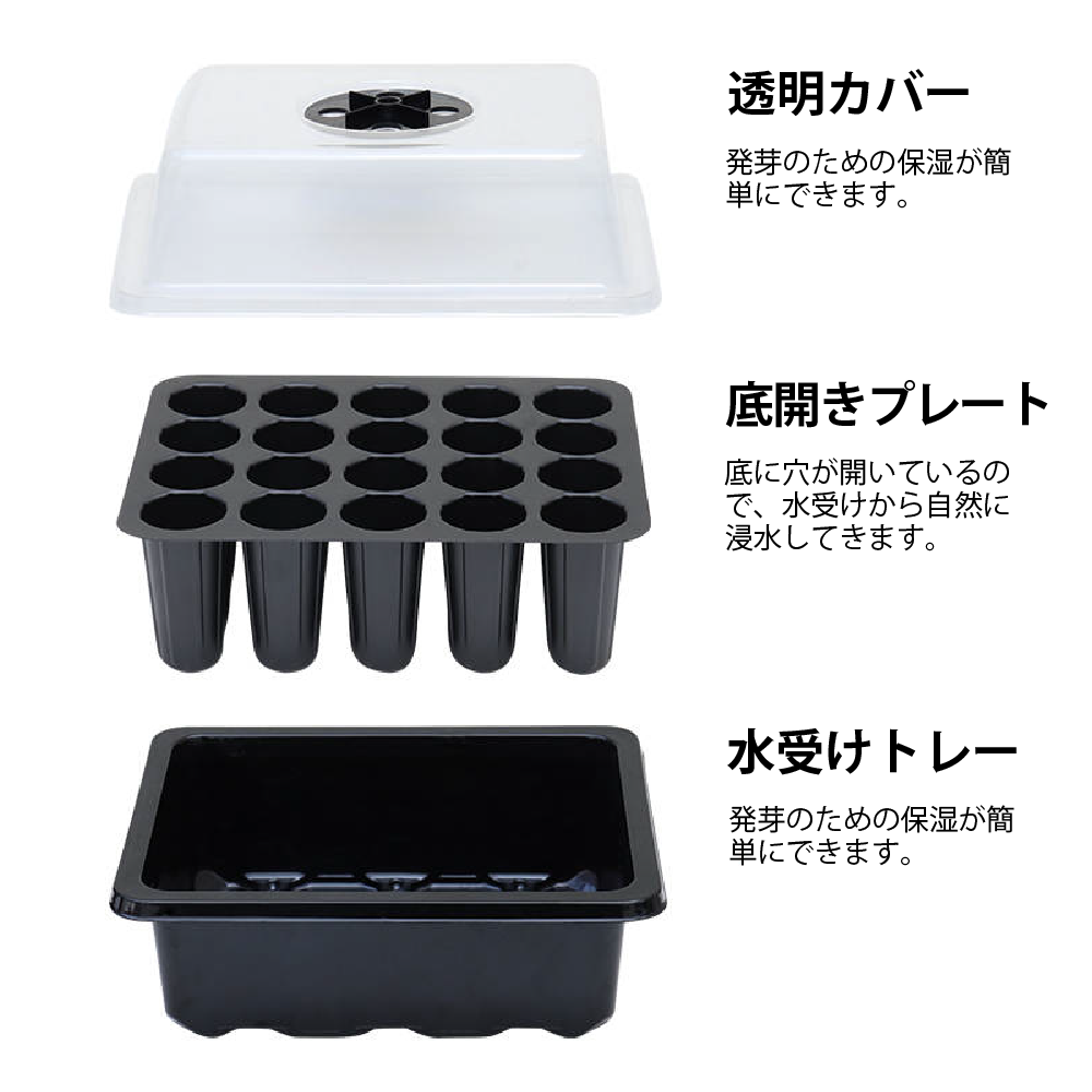 - ミニ温室:透明なカバーは、温度と湿度を保つためのミニ温室として機能します。これにより、発芽や若い苗の成長を促進します。